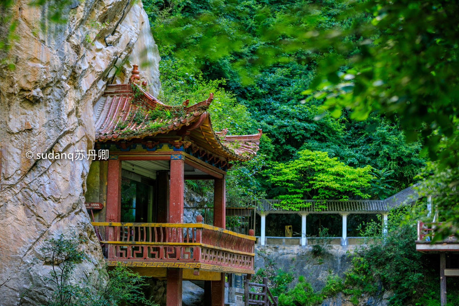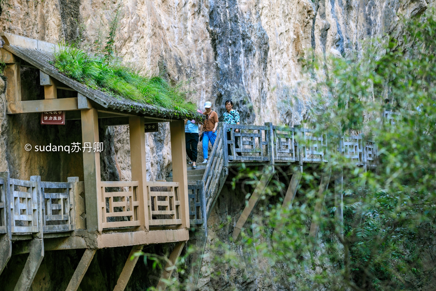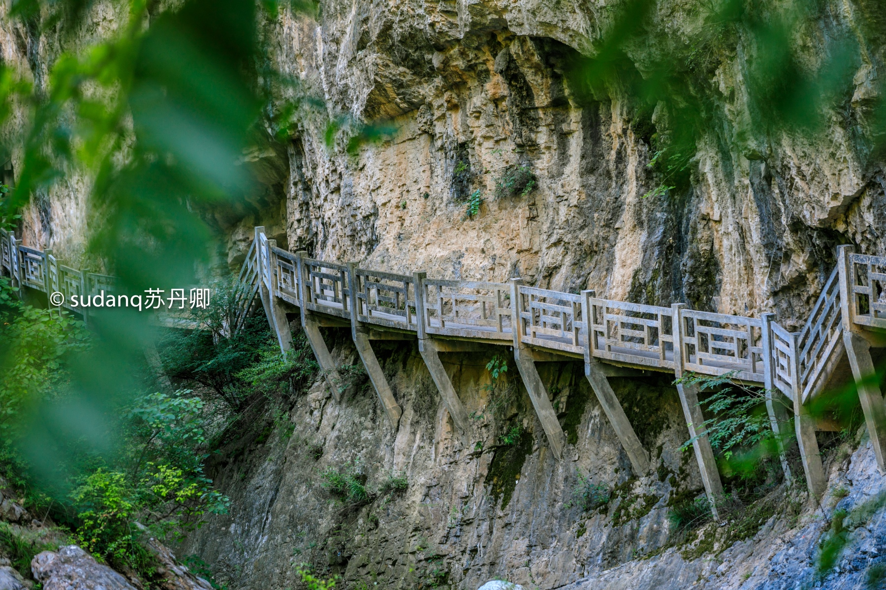 这里风光清幽绮丽,青山对峙,涧流清澈,最是令人感到“世外”的是那高低不同的悬崖栈道,因风吹雨打而生出的古朴自然好似是古人搭建出来的。
