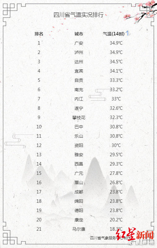 午后2点四川省内城市气温排行(据@四川气象)