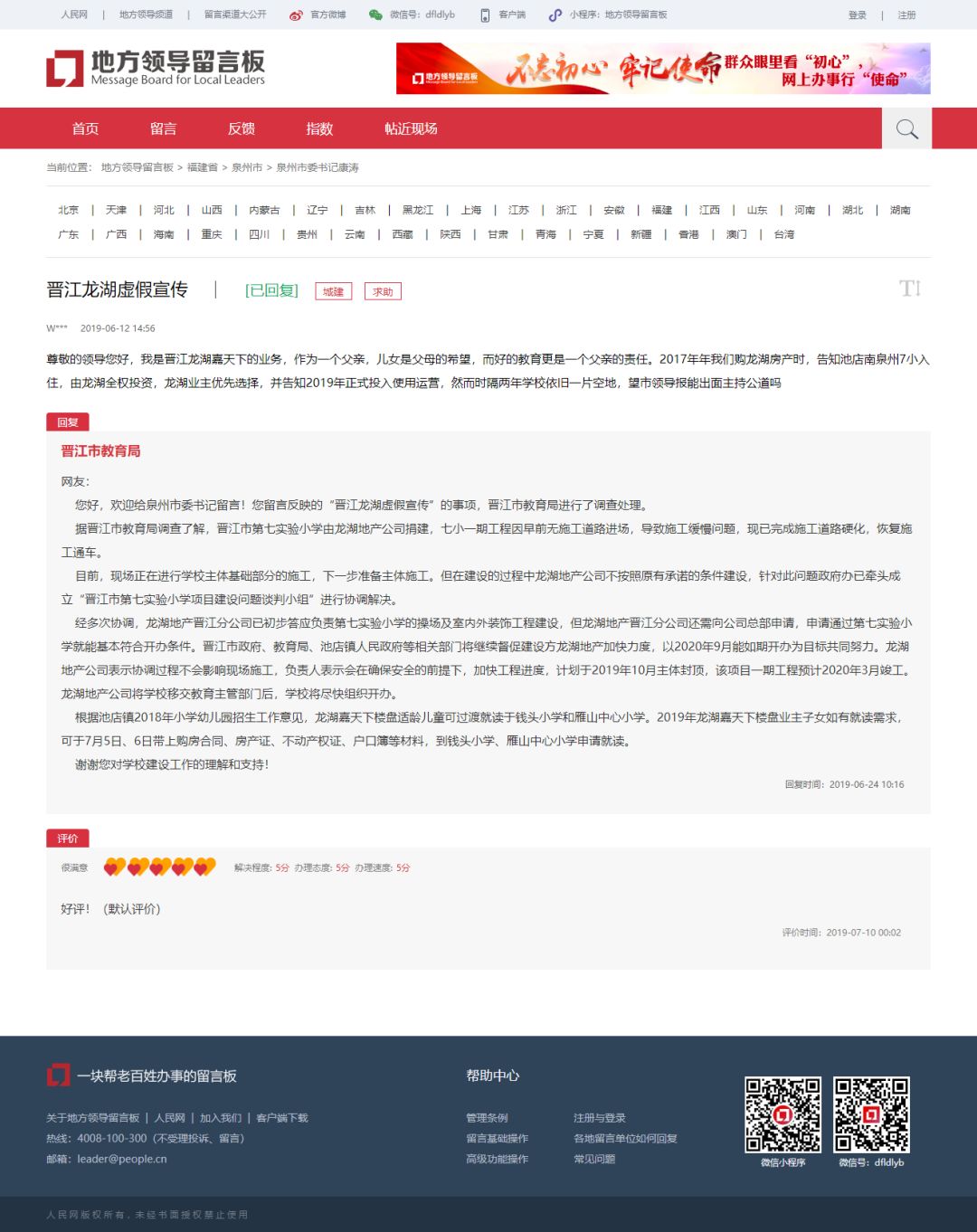 晋江市教育局答复:经多次协调,龙湖地产晋江分公司已初步答应负责第七实验小学的操场及室内外装饰工程建设,但龙湖地产晋江分公司还需向公司总部申请,申请通过第七实验小学就能基本符合开办条件。晋江市政府、教育局、池店镇人民政府等相关部门将继续督促建设方龙湖地产加快力度,以2020年9月能如期开办为目标共同努力。龙湖地产公司表示协调过程不会影响现场施工,负责人表示会在确保安全的前提下,加快工程进度,计划于2019年10月主体封顶,该项目一期工程预计2020年3月竣工。龙湖地产公司将学校移交教育主管部门后,学校将尽快组织开办。