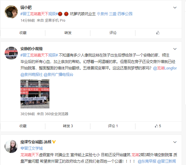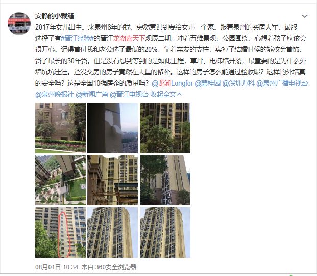 近日,微博不少网友反映晋江龙湖嘉天下观宸二业主发帖投诉!据传,疑似龙湖地产内部人士回应:关于近期观辰二期业主反馈涂料脱落事宜,我司正面回复:1.本项目将于2019年12月份交付,目前小区还在整体效果提升阶段。2.业主反馈的现象,只是我司工程针对局部不平整位置进行打磨平整提升,并非质量缺陷问题。3.为了提高观辰二期品质及观感,我司工程结合业主们过程提出的宝贵意见,对外墙涂料进行自查品质提升施工,目前还在提升施工阶段,属于正常施工范畴,非最终交付使用状态,最后请业主朋友们勿信谣言。