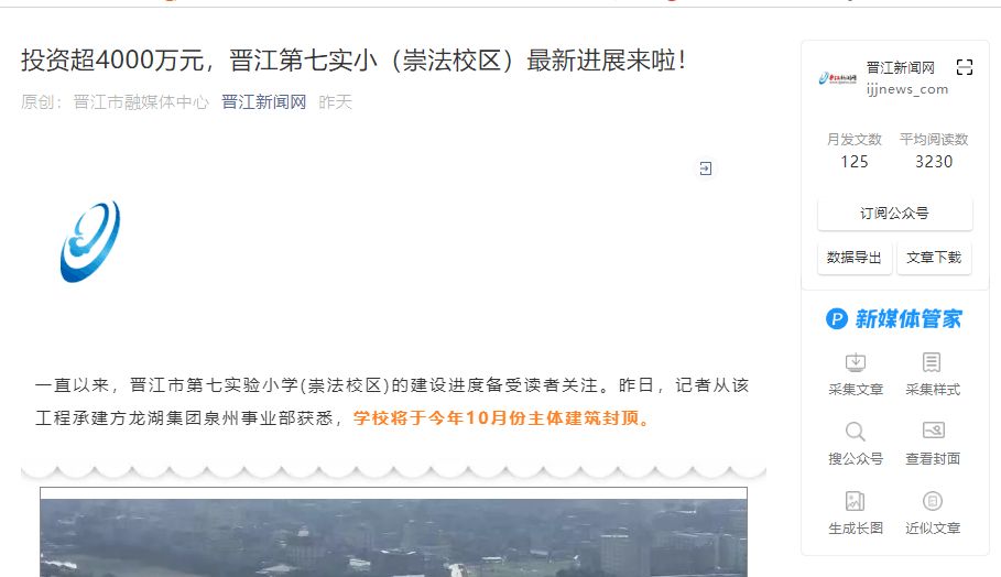 8月1日,晋江新闻网报道:记者从该工程承建方龙湖集团泉州事业部获悉,学校将于今年10月份主体建筑封顶。