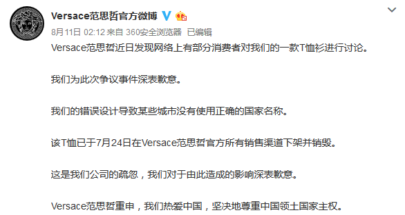 范思哲11日凌晨对此进行道歉,称该T恤已于7月24日在官方销售渠道下架并销毁。