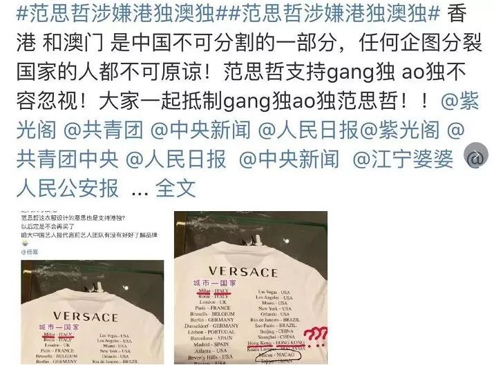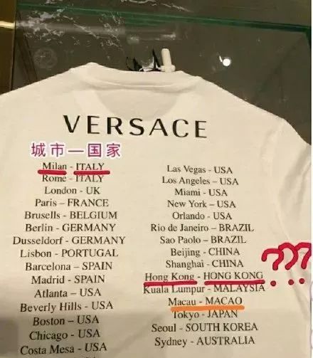 近日,有网友爆料称,意大利奢侈品牌范思哲(Versace)的一款T恤把香港和澳门列为单独国家,引发争议。