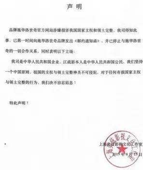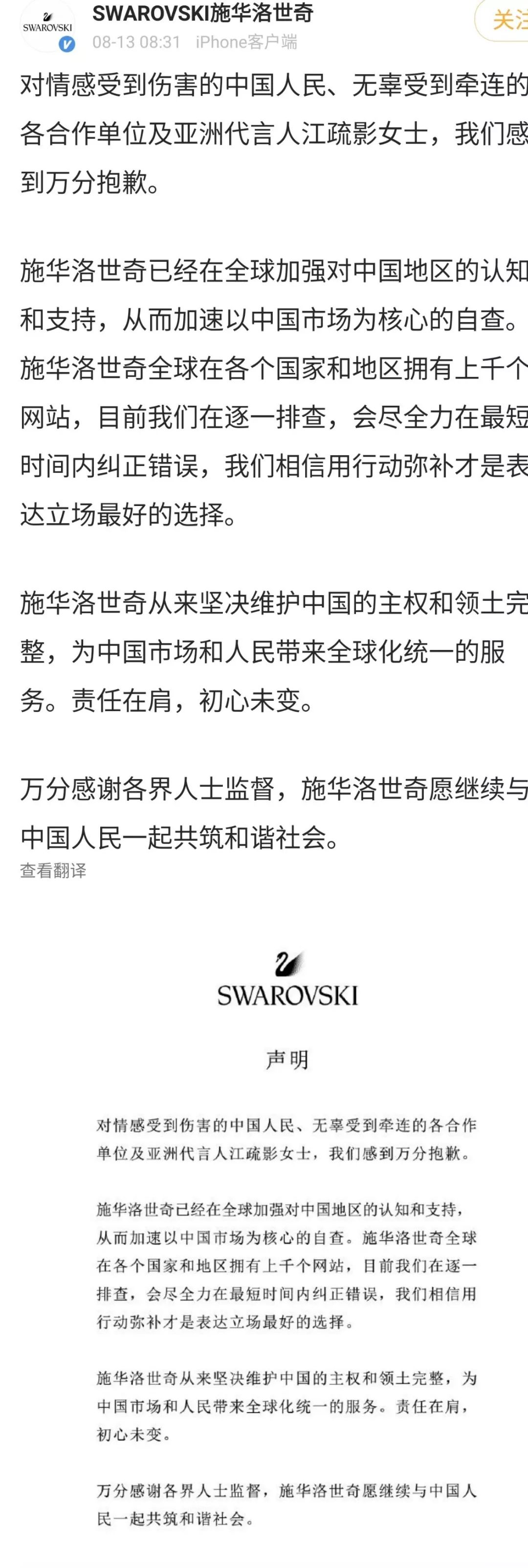 在声明中,施华洛世奇亦对其亚洲代言人江疏影表达歉意。