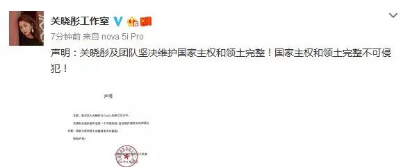 12日中午,关晓彤工作室也发布声明:“目前,我司艺人关晓彤与Coach品牌已无合作,关晓彤及团队始终坚持一个中国原则。”