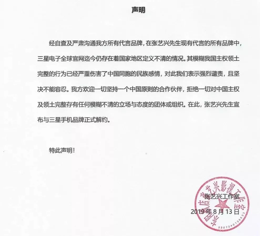 声明称,在张艺兴现有代言的所有品牌中,三星电子全球官网迄今仍存在着国家地区定义不清的情况,其模糊我国主权领土完整的行为已经严重伤害了中国同胞的民族感情,“对此我们表示强烈谴责,且坚决不能容忍”。张艺兴宣布与三星手机品牌正式解约。