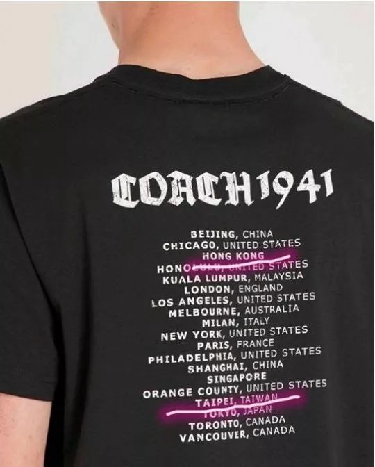 在这款名为“COACH1941”的T恤背面,印有多个城市和国家的名称,其中北京和上海后面都有中国,然而香港则独立一个版块,并未在其后加上中国(China)字样,而在台北(Taipei)后面则直接加上了台湾(Taiwan),与加拿大、中国、美国等国家名称并列。