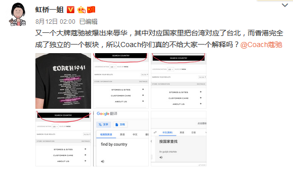 8月12日凌晨2点,网友“虹桥一姐”在微博上爆料说:“又一个大牌蔻驰被爆出来辱华,其中对应国家里把台湾对应了台北,而香港完全成了独立的一个板块,所以Coach你们真的不给大家一个解释吗?”博文还同时@Coach蔻驰官方微博。