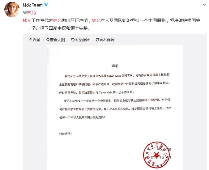 8月13日晚,林允工作室发布声明,宣布宣布与Calvin Klein停止一切合作关系,“林允本人及团队始终坚持一个中国原则,坚决维护祖国统一,坚定捍卫国家主权和领土完整。”据悉,此前CK美国官网内涉及我国国家主权与领土完整也存在表述不准确问题。
