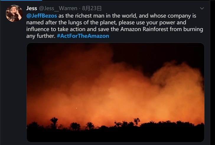 推特用户纷纷加入了#ActForTheAmazon#的话题标签,并将其直接@了贝索斯,请求他利用自己的财富帮助结束这场危机。