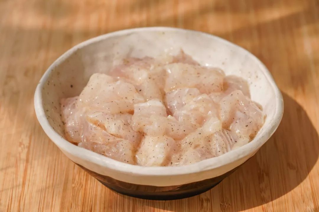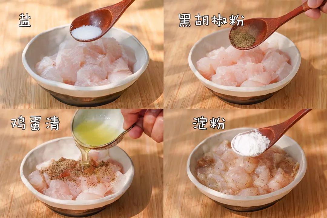 2、龙利鱼里放入半勺黑胡椒粉、1个鸡蛋清、半勺盐和1勺淀粉拌匀,备用。
