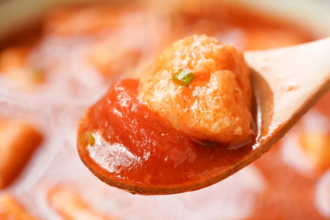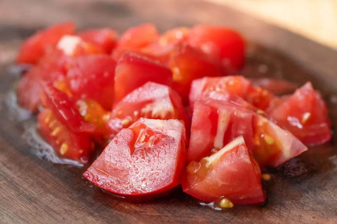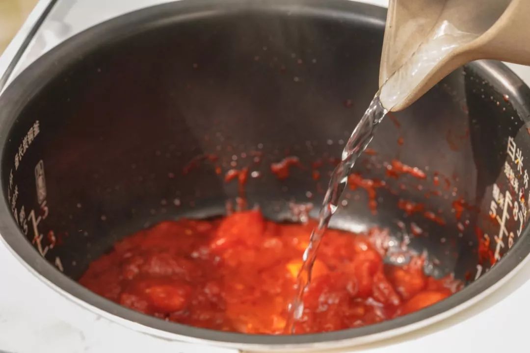 3、电饭锅内倒入少许油,放入切好的番茄、3勺番茄酱和600ml水,按下煮饭键。
