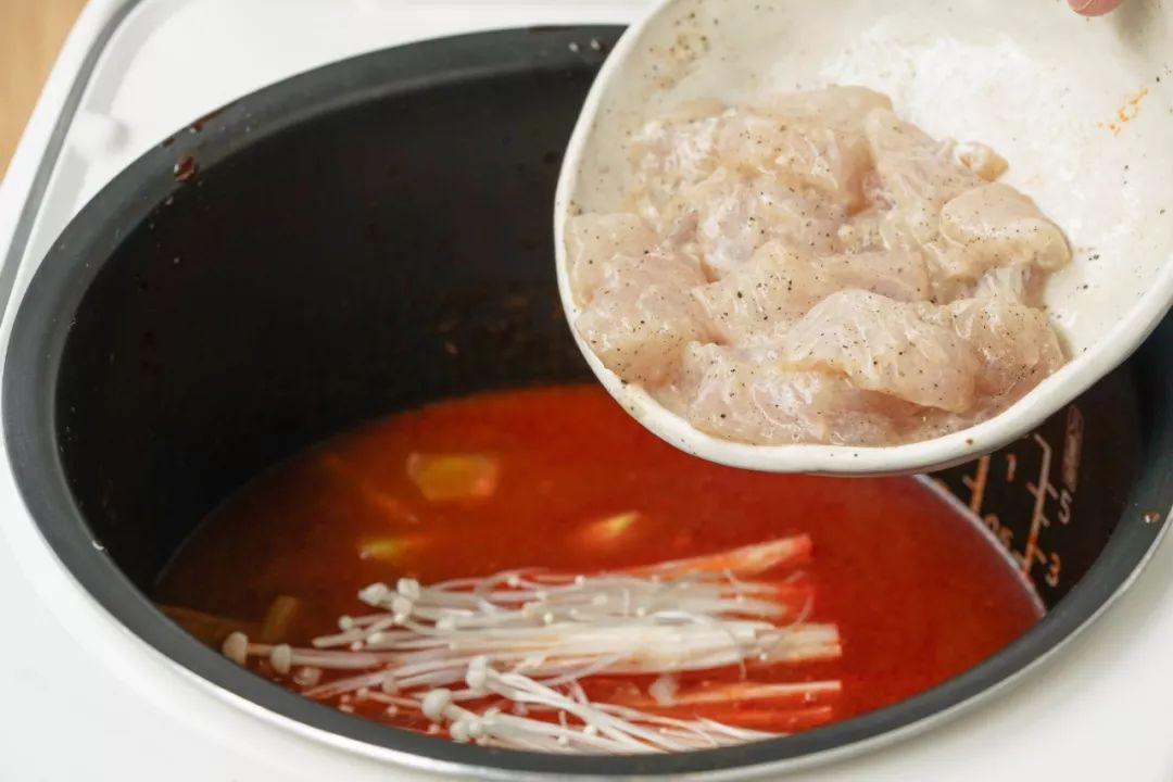 4、在电饭锅工作时间剩余5分钟时,放入龙利鱼、莴笋和金针菇,再放入1勺糖、半勺盐继续焖煮5分钟。