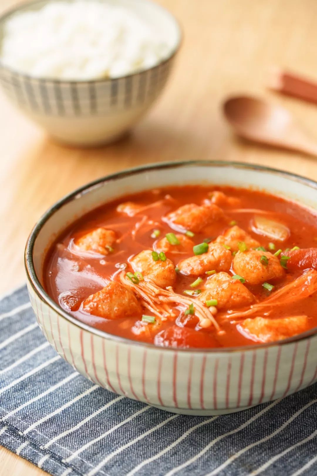 1、1片龙利鱼切成2cm左右的小块备用;2个番茄洗净去皮切滚刀块备用;1根莴笋洗净去皮切滚刀块备用;1小把金针菇洗净去根撕成小朵备用。