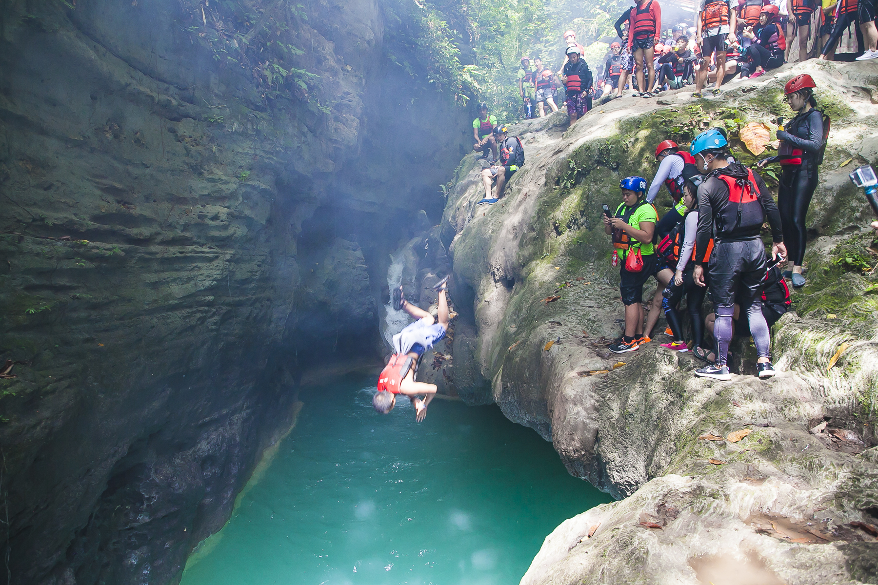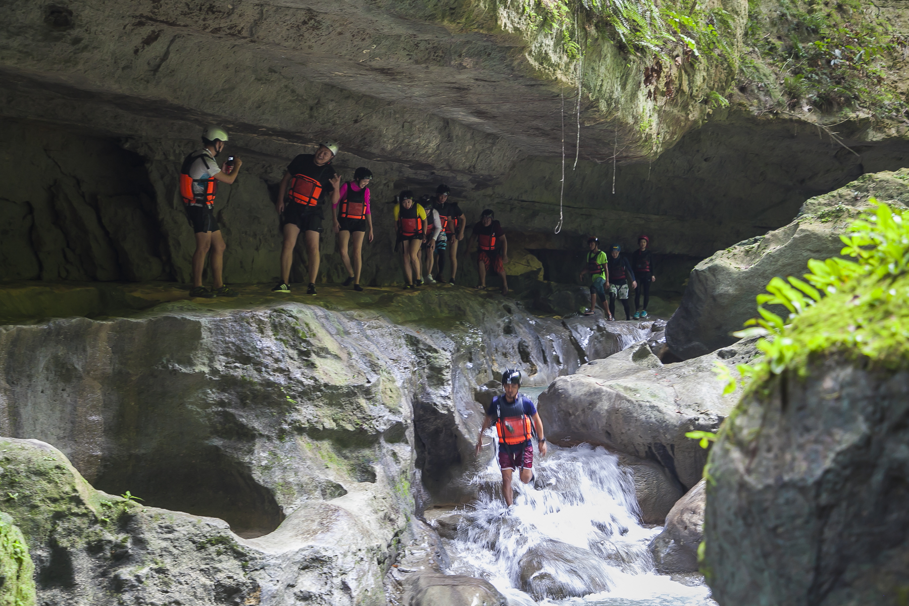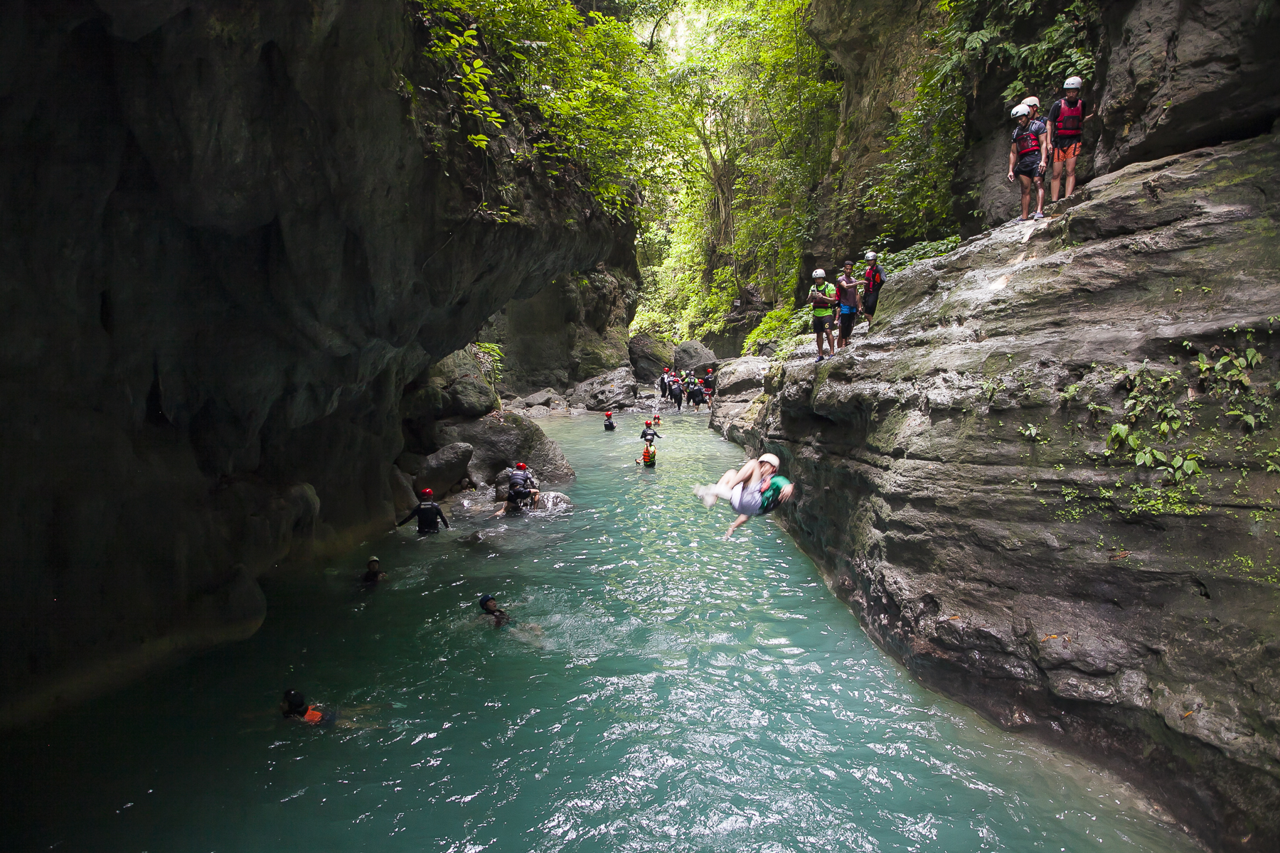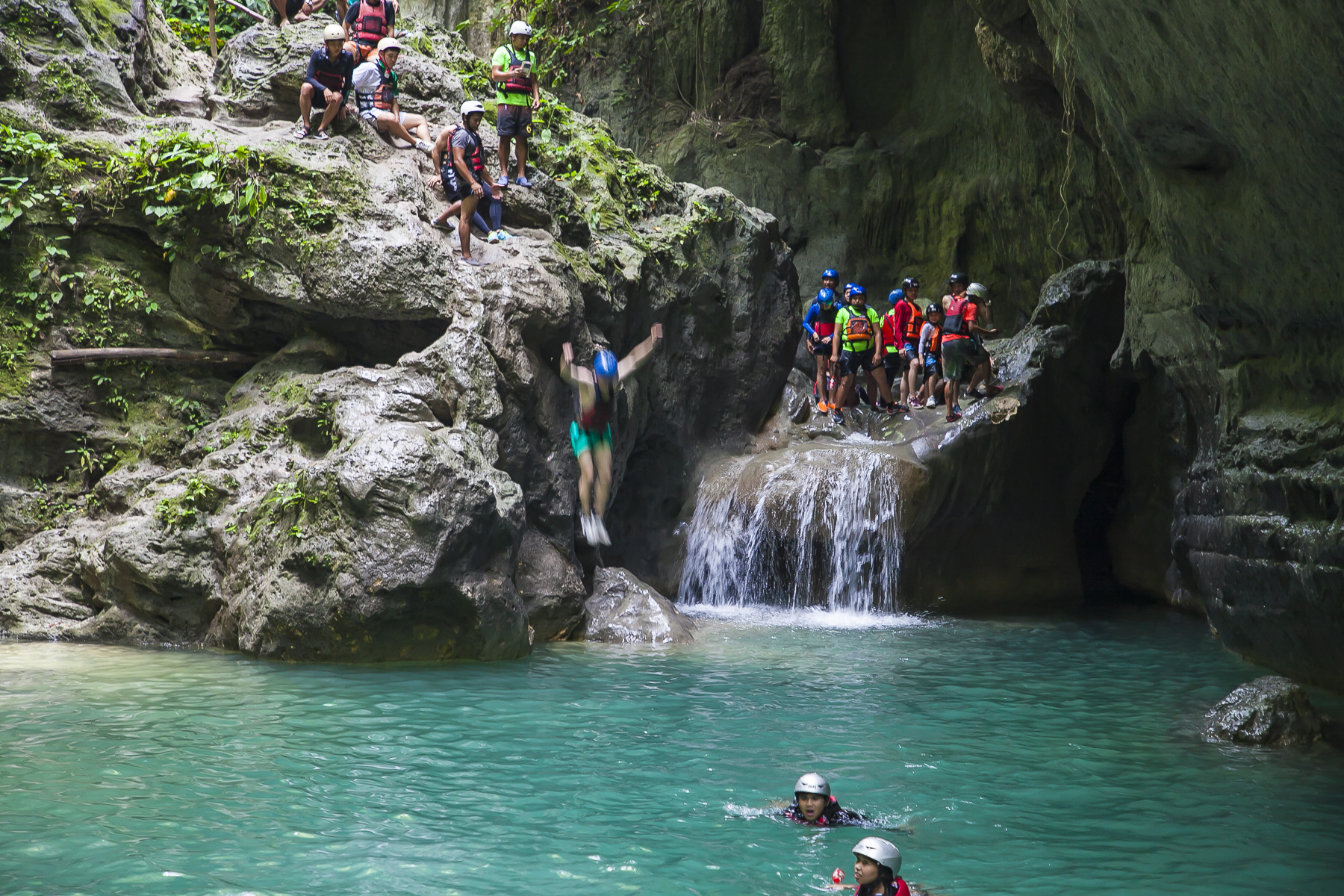由于菲律宾的蹦谷大多是在瀑布附近进行,需要沿着瀑布跳水的环节比较多,因此在这里就叫“蹦谷跳水”。蹦谷跳水需要一颗强大的心脏,一旦你进入到卡瓦山瀑布群,是没有回头路可以走的。