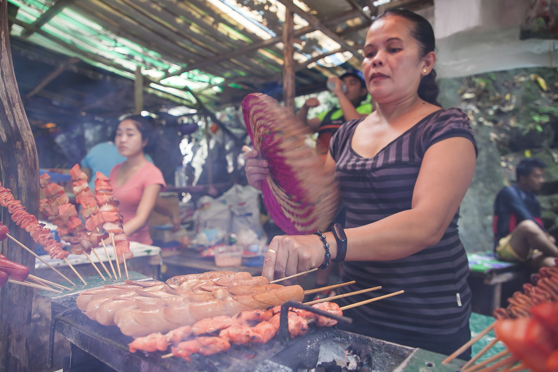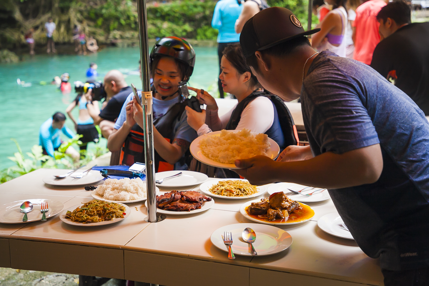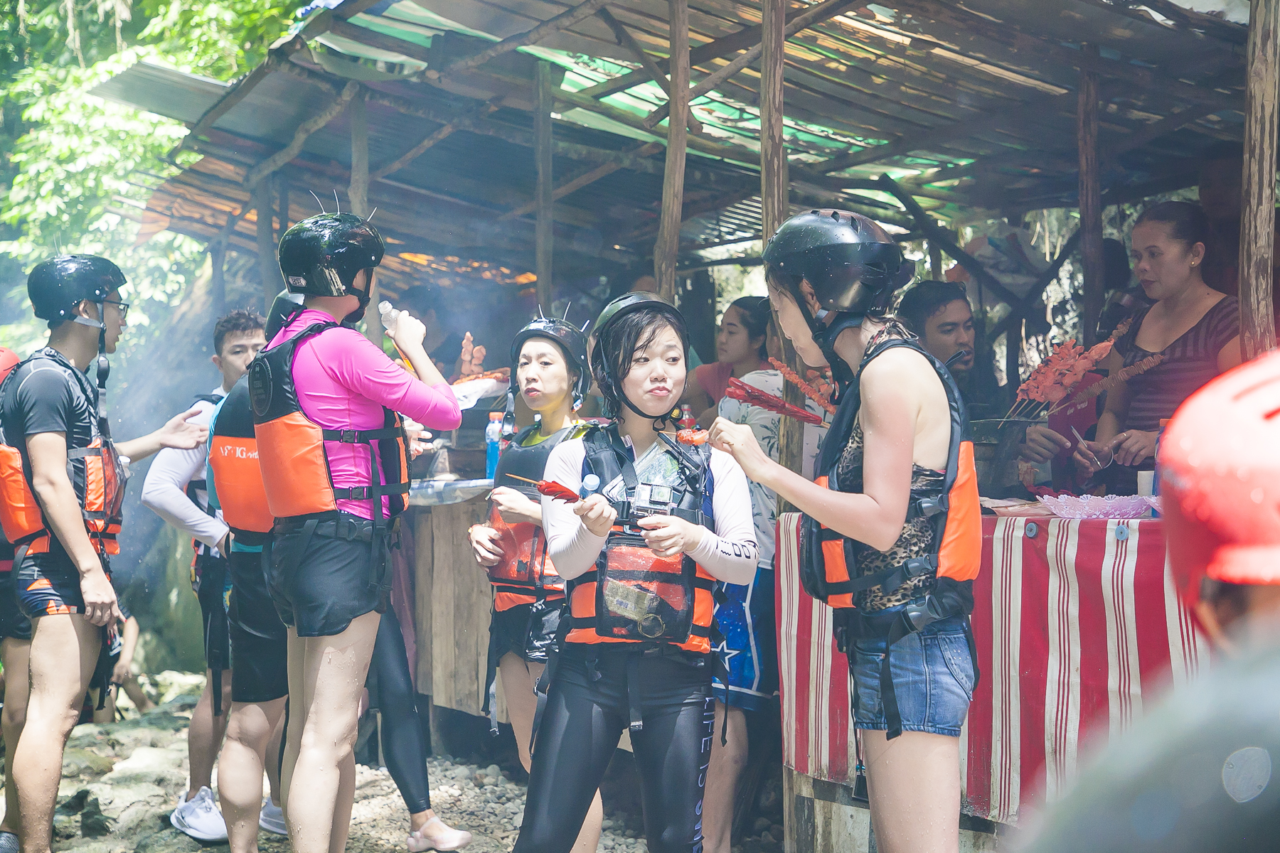 由于山谷很长,蹦谷体力消耗也大,在山谷里有一处烧烤摊,各种烤串供冒险者选择,这里的烤火腿是我吃到的最美味的火腿了,也许是太累太饿的原因吧。午餐也是在山谷里,烧鸡肉、牛排、炒米粉、米饭等供你补充能量,吃饱喝足,下一段的瀑布跳跃就要又开始喽。