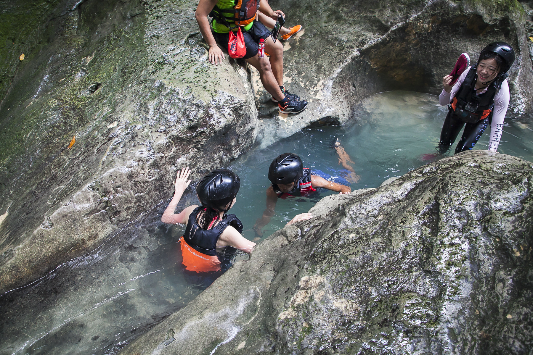 3、不管是趟河、走路,还是瀑布跳跃,一定要谨遵领队的要求,跟着领队踩过的路线走,要不然水底坑坑洼洼,暗流涌动,石头光滑,特别容易摔倒。