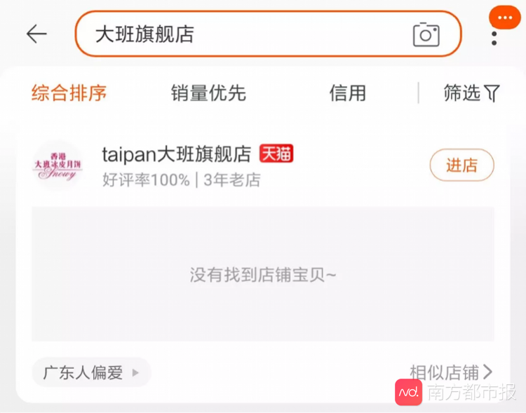 此前,大班在天猫和京东上均设有旗舰店。但今天早上南都记者通过手机淘宝搜索“大班旗舰店”,显示“没有找到店铺宝贝”,点击店铺进入显示“店铺不存在或者店铺已关闭”。