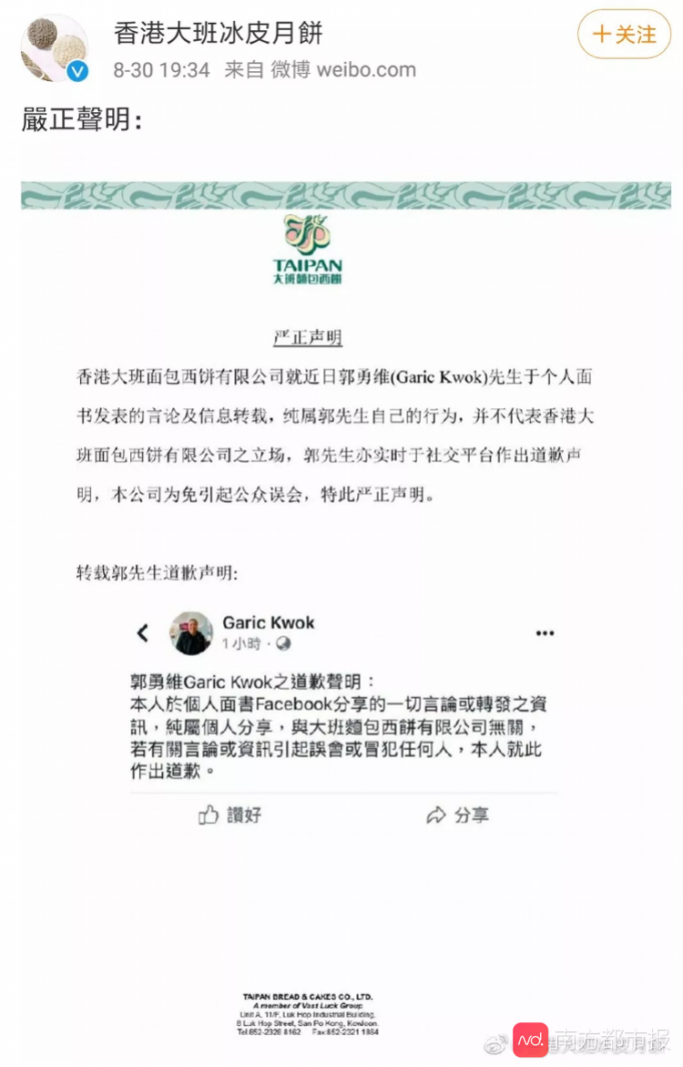 由于网友反响较大,8月30日19时34分,@香港大班冰皮月饼 在微博上发表声明。声明称这“纯属郭先生自己的行为,并不代表香港大班面包西饼有限公司的立场。”该声明下附带着郭勇维此前在Facebook上的道歉声明。
