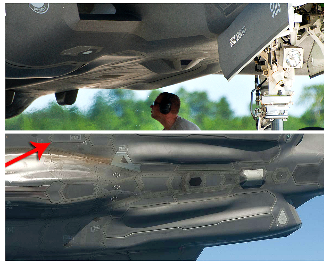 △F-35的弹舱门特写,白色部分为内层,灰色部分为外层,可发现内舱盖边缘多出白色的内层,外舱盖则多出灰色的内层,以“外压内”方式闭锁舱门