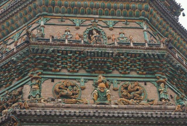 飞虹塔是五座佛祖舍利塔,也是迄今为止发现的留有工匠题款、最大最完整的琉璃塔。它和曾在这里珍藏的《赵城金藏》、水神庙元代壁画,并称为“广胜三绝”。