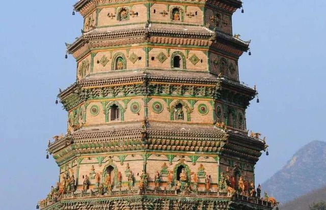 第二层以上塔身外表全部镶嵌有琉璃仿木构件,各层檐下俱施琉璃花罩和垂莲柱,以及屋宇、楼阁、亭台、角柱、佛龛、花卉、人物、翔凤、狮、象等琉璃构件,一层一组图案,形式多样。