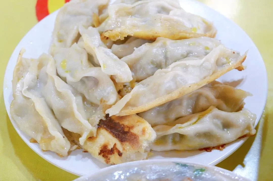 阿球点的是“小街锅贴”。大约是猪肉大葱馅。