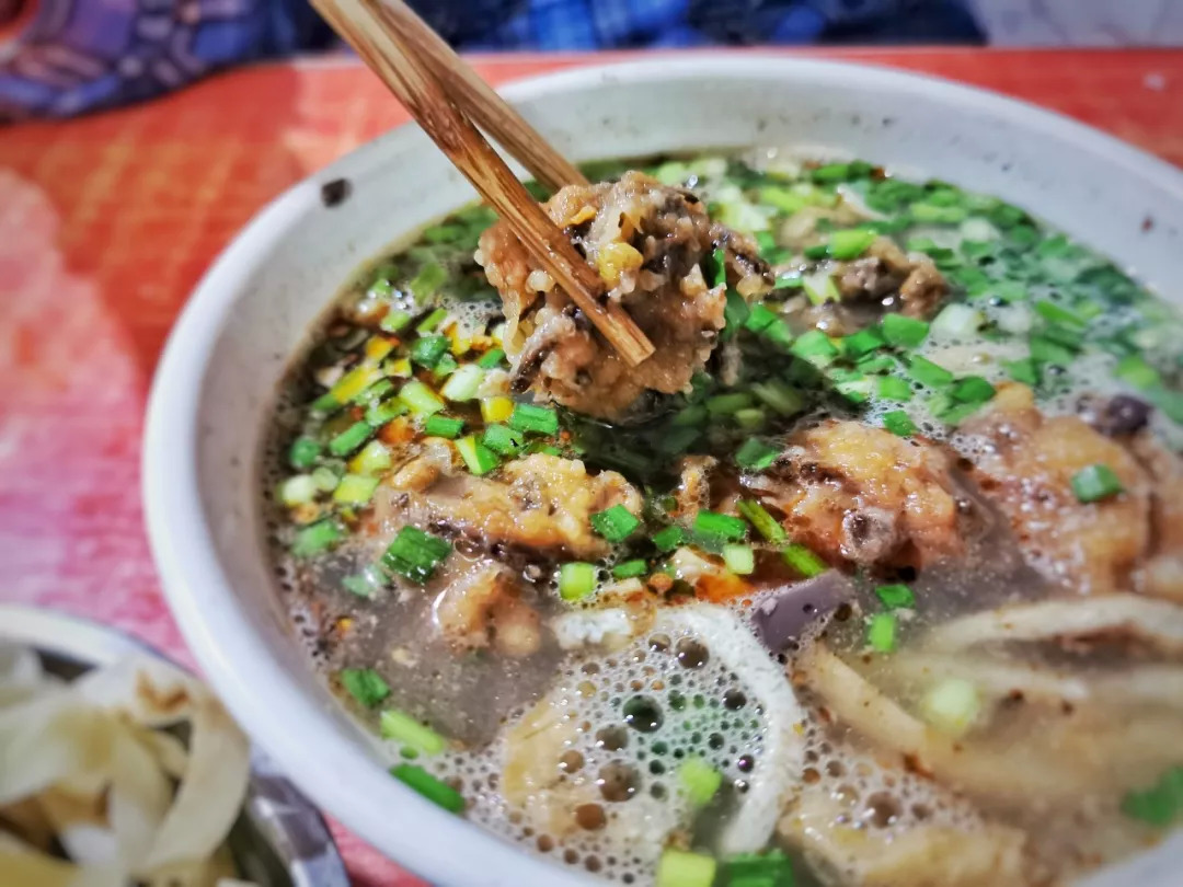 飘在汤面上满满的葱、以及打汤时加入的一勺辣椒是驱散雨天寒气的“利器”。