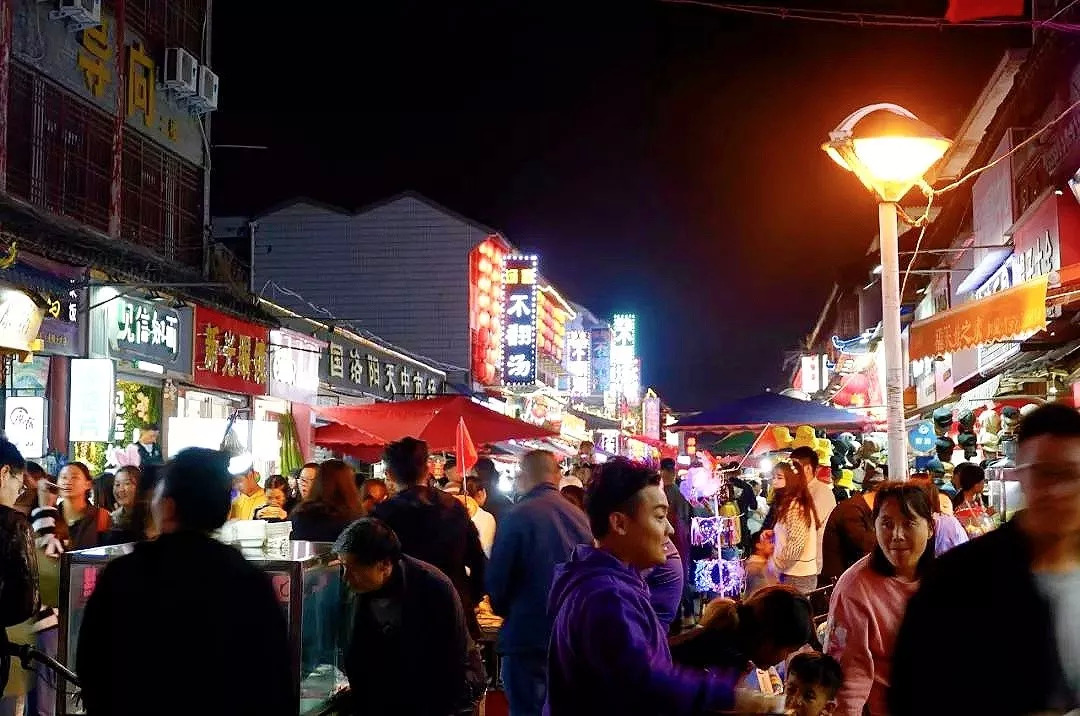 挂着灯笼的路口晚上就会变身洛阳最有名的十字街夜市,下午6点就有小商贩们拉着小吃车来摆摊,等到8点满满人潮让你被人群挤着走。