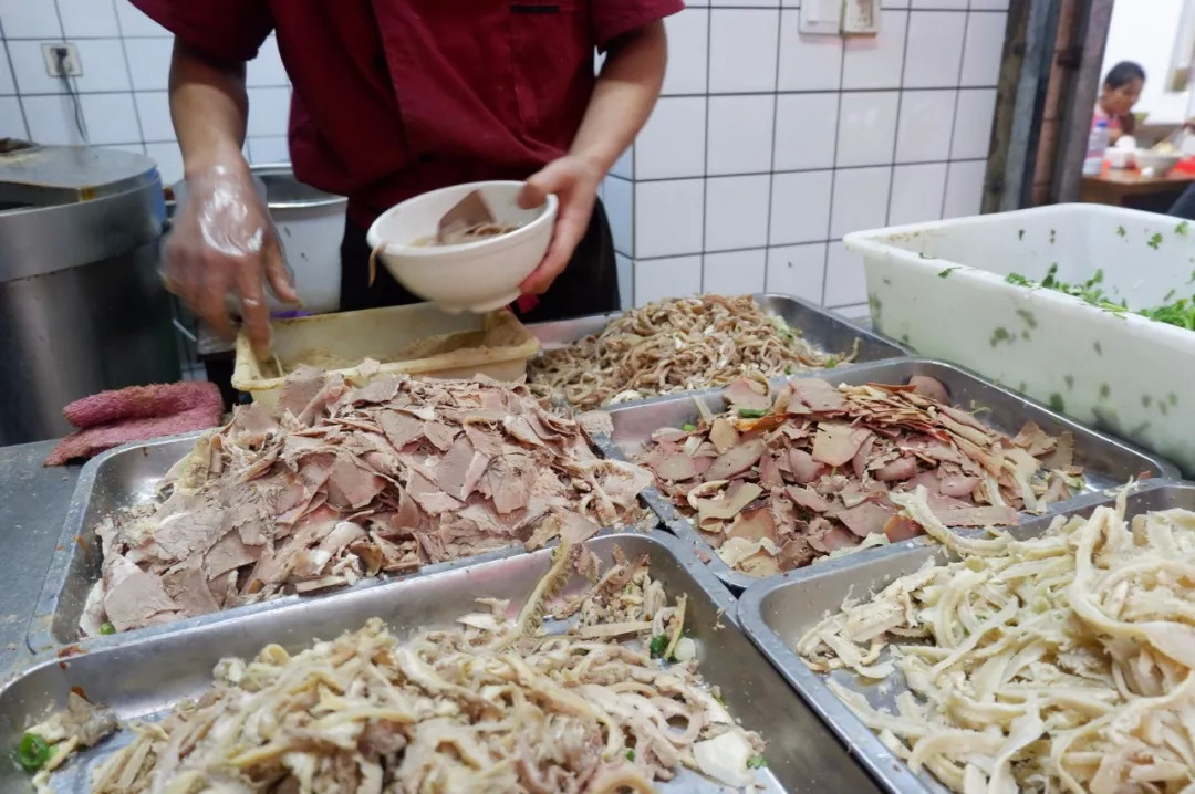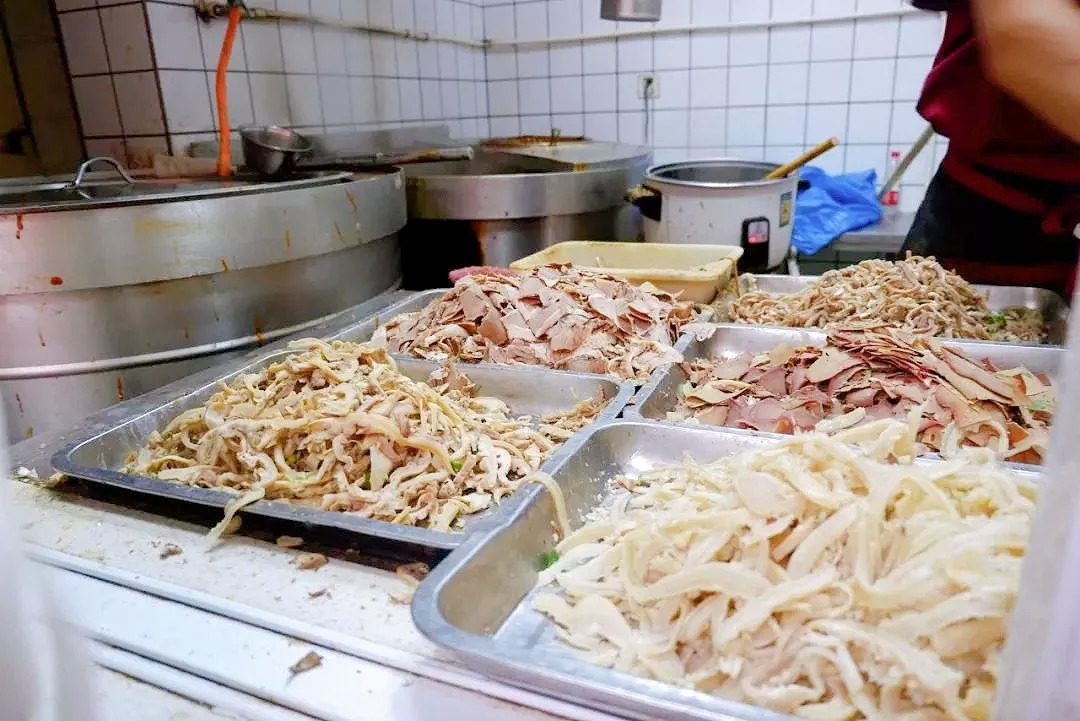 烩面馆,一般都会配套凉菜档口。调一份素拼,在烩面上来之前填肚子,但阿球更爱的是用凉菜的汤蘸烩面。