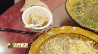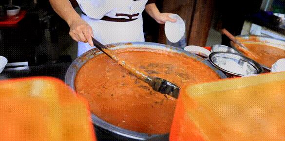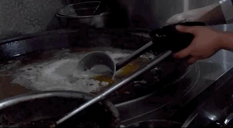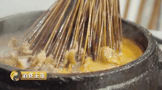 三家汤店的打汤步骤:碗里放入肉和配料,浇一遍汤再把汤倒进锅里,调味,之后再浇汤,完成