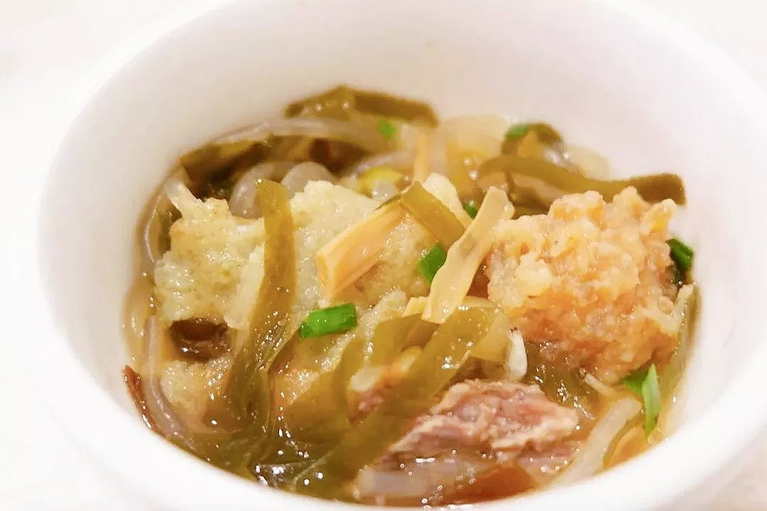 一碗料很多。粉条、海带、虾皮、紫菜、黄花菜、鸡血、榨菜还有虾仁和疑似小鲍鱼。