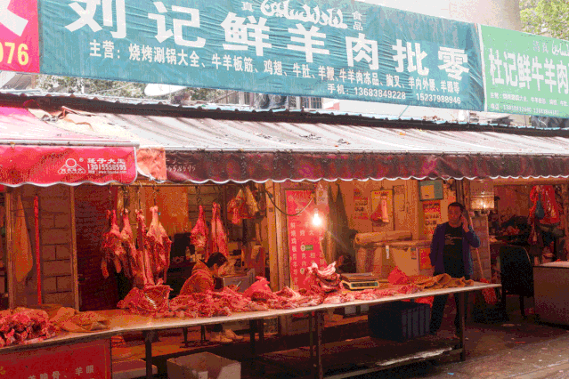 鸡肉、牛羊肉、鱼类海鲜……琳琅满目。整头的羊或猪悬挂着,各个肉铺都磨刀霍霍,莫名有点江湖气。