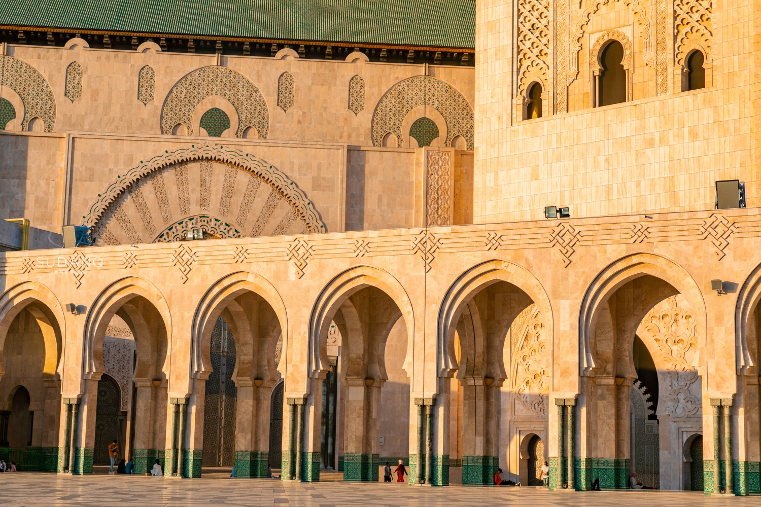 典型北非风格的方柱形宣礼塔高达210米,是摩洛哥最高的建筑物。寺内和广场上的装饰由国内六千位能工巧匠用了几年时间精雕细琢的作品。