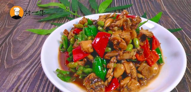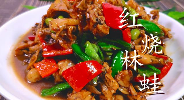 6、等汤汁收浓时,再放入青红椒片,翻炒断生,再撒入少许白胡椒粉,装盘美味即成。这样一盘鲜美入味的红烧林蛙就做好了