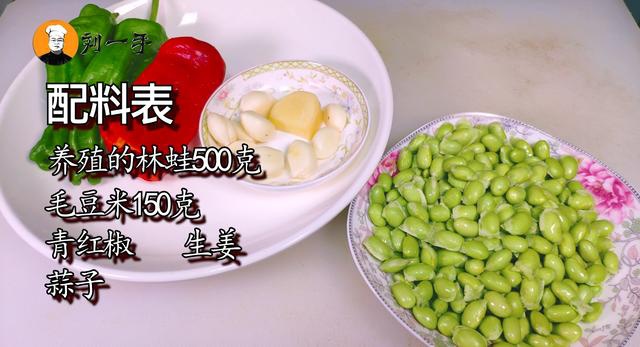 样子的林蛙500克、毛豆米150克、青红椒、生姜、蒜子