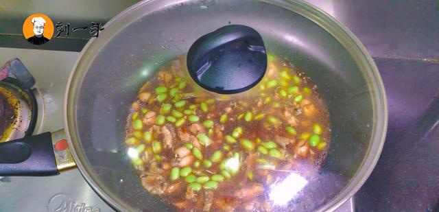 5、热锅倒油,先放入姜蒜片爆香,再放入林蛙块翻炒片刻,然后放入一勺海鲜酱,适量生抽、老抽、白糖两勺提鲜、盐半勺、少许料酒锅边淋入去腥,再翻炒入味,然后放入漫过食材的凉水和毛豆,盖上锅盖,大火烧开,中小火慢炖十分钟