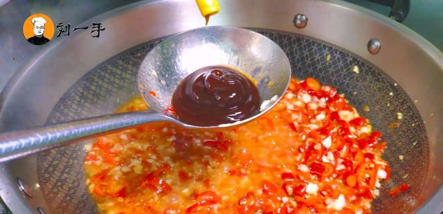 5、热锅倒油,再放入姜蒜末爆香,然后放入美人椒圈、剁椒酱炒香,然后再翻入蚝油、黄豆酱两勺、生抽、料酒、白糖一勺提鲜。