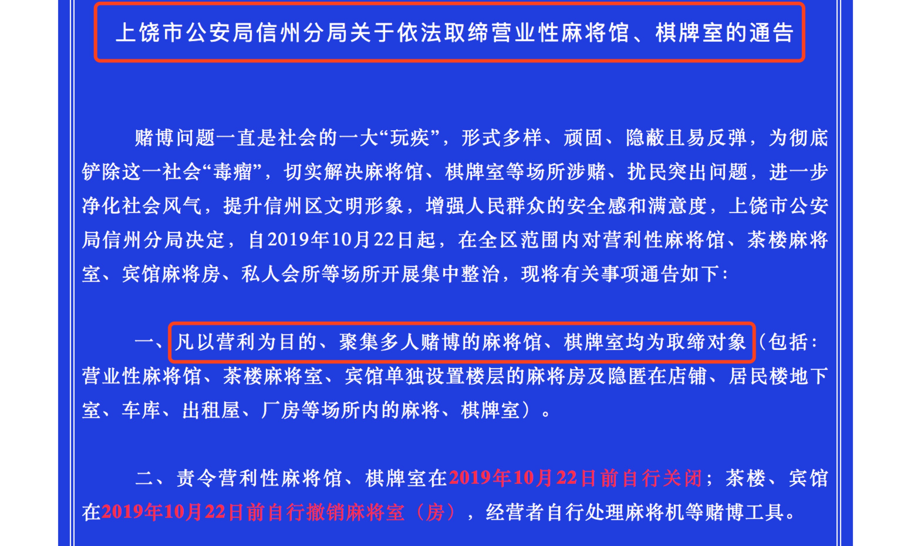 10月20日,上饶市公安局信州分局在其官微“信州公安”发布了《上饶市公安局信州分局关于依法取缔营业性麻将馆、棋牌室的通告》,取缔范围包括“营业性麻将馆、茶楼麻将室、宾馆单独设置楼层的麻将房,及隐匿在店铺、居民楼地下室、车库、出租屋、厂房等场所内的麻将、棋牌室”。