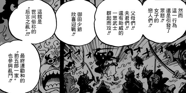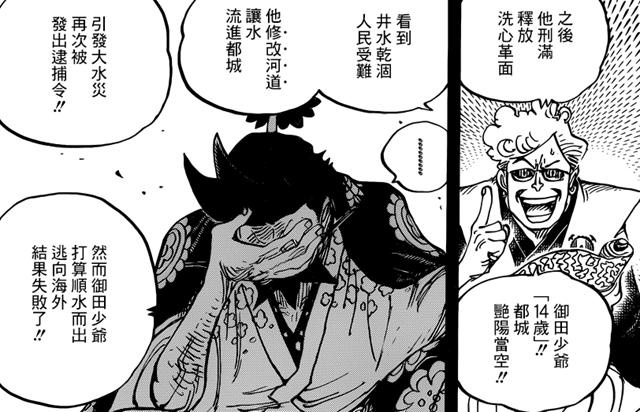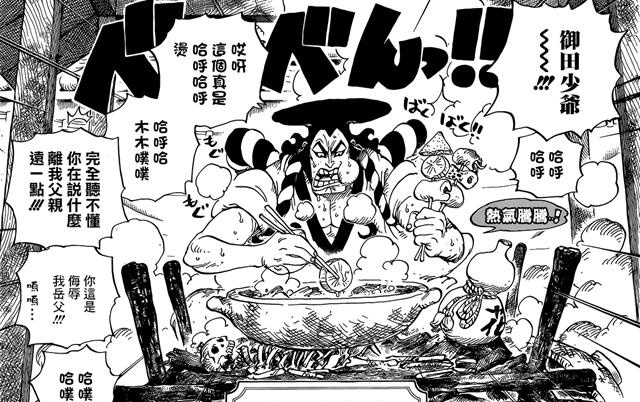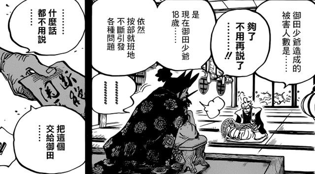 最重要的一件事,就是光月御田终于登场了,然而却是个无法无天的混世魔王,堪称灾祸发动机。御田的父亲光月寿烧喜,对于御田这种引发灾祸的儿子,感到了身心疲惫,于是决定和御田断绝父子关系。