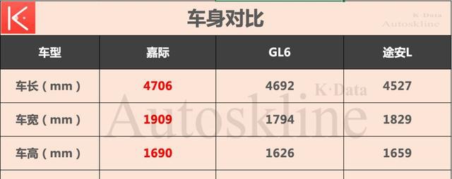 嘉际车型长、宽、高分别为4706mm*1909mm*1690mm,轴距到达2805mm;途安L的长宽高数据为4527*1829*1659mm,轴距为2791mm;GL6车身尺寸则4629*1794*1626mm,轴距为2796mm。经过数据对比不难发现,无论是轴距还是长、宽、高,嘉际在同级别中是非常优秀的。