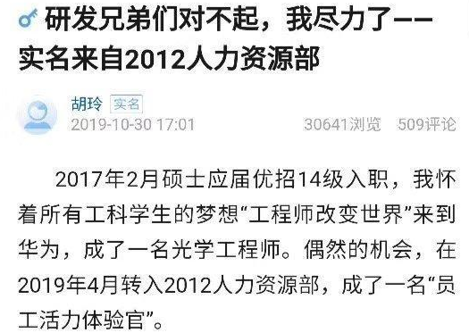 华为HR胡玲此帖子一出,立马引发外界的关注,有华为离职员工在知乎上发表长文对此进行了评价: