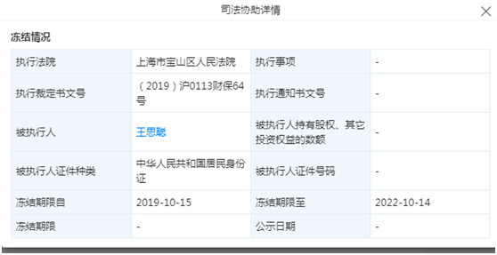 此前,据天眼查显示,由王思聪担任执行董事并持股100%的北京普思投资有限公司的股权遭到上海市宝山区人民法院冻结,具体冻结数额不详,冻结日期自2019年10月15日起至2022年10月14日。