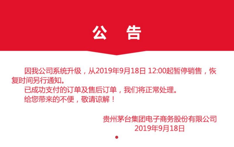今年9月18日,贵州茅台集团电子商务公司在茅台商城(emaotai.cn)发布公告称,即日起“因公司系统升级,即日起暂停销售,恢复时间另行同时”,直至今日该公告依旧挂在官网首页。