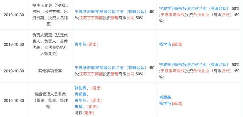 天眼查信息显示,贵州乾济科技有限公司于10月30日发生多项工商变更,肖华伟卸任法人代表;与此同时,江苏京东邦能投资管理有限公司,即京东的投资实体将所持有50%的股份转让给了宁波虔济股权投资合伙企业(有限合伙),后者最大持股股东即为肖华伟。