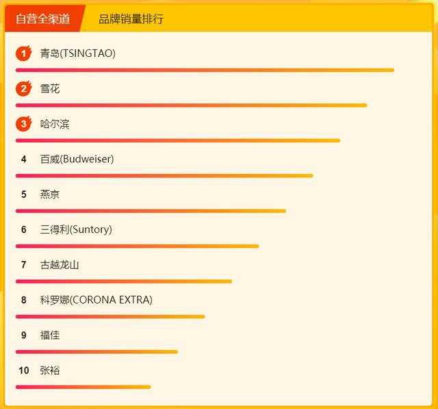 至于红酒和啤酒品类,青岛、雪花、哈尔滨三强排在销量前三位也算是意料之内。大多数国人在购买啤酒的时候,抛开本地品牌不说,这三个品牌的产品应该是被消费者考虑最多的,所以它们的销量自然也会排在前列。百威能排在第四也算努力,如果双十一有更多的促销活动,那么这个榜单或许还会产生一定的变化。相对于啤酒而言,红酒对于国人而言可能不是那么热衷,古越龙山这样的黄酒品牌和张裕这样的老字号红酒品牌能上榜已经很不容易了,不过如果没有特殊的情况,那么这个榜单在一定时间内多半还是由国内啤酒品牌所把持。