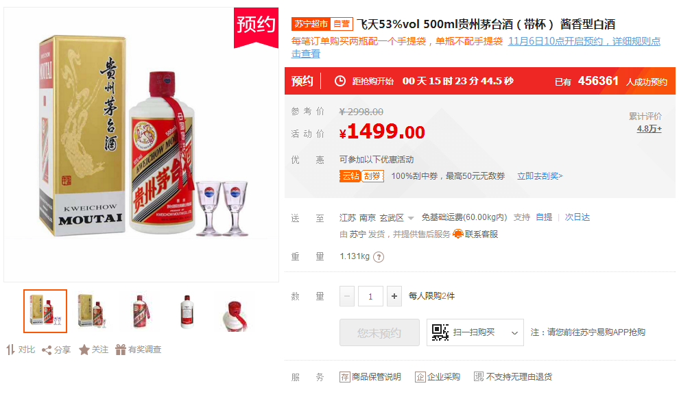 据悉,凡是之前预约成功但没有抢到飞天茅台酒的苏宁实名认证super会员,都可以抢,每人限购2瓶。