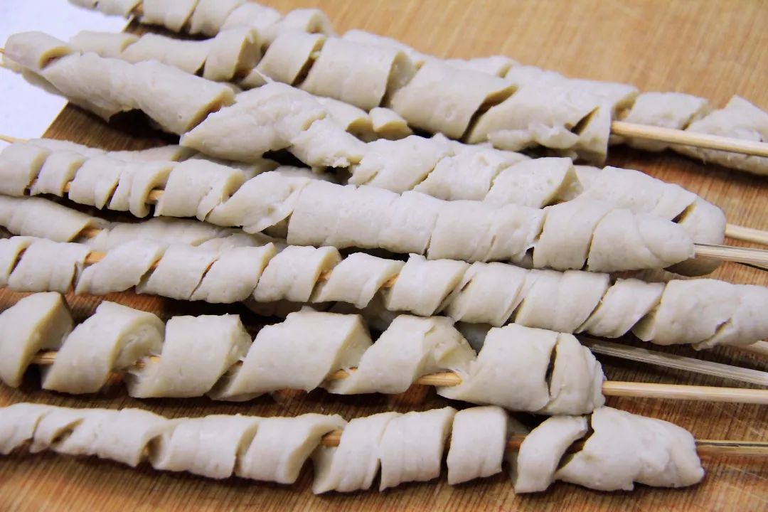 11. 再用刀转着斜切,将面筋切成串,并适当调整松动一些。