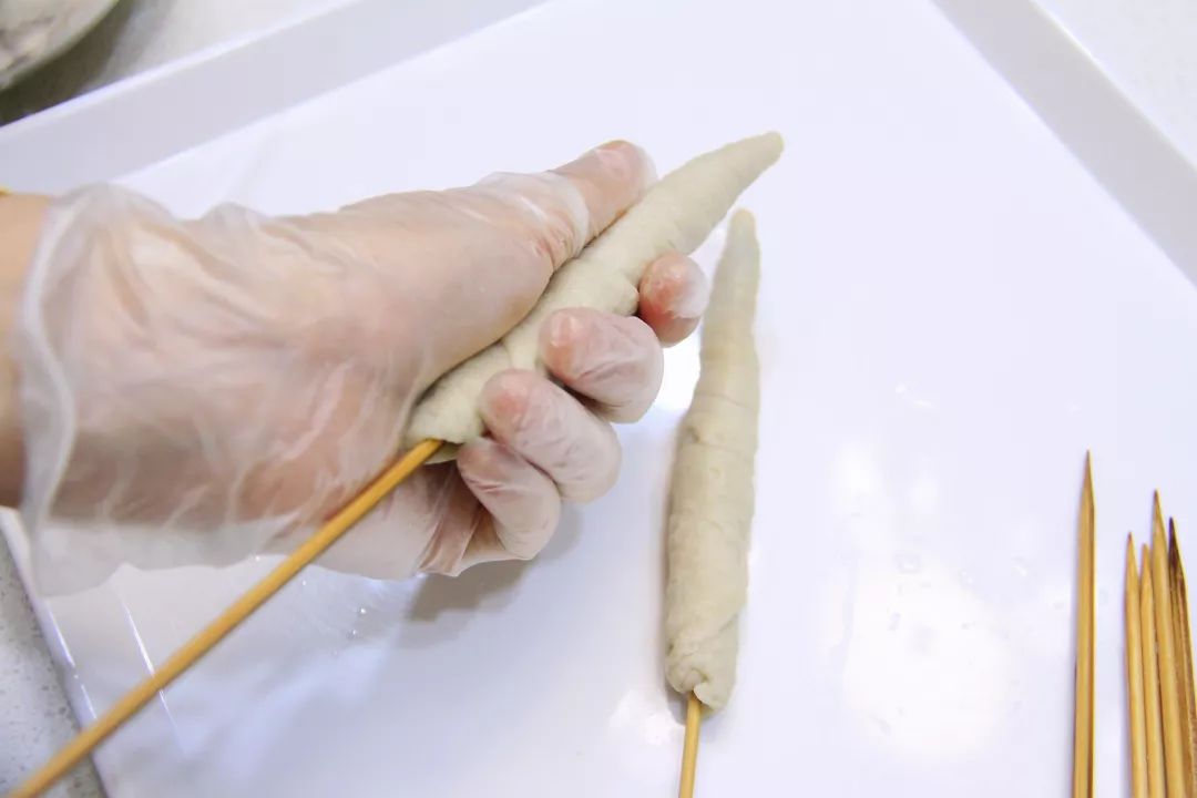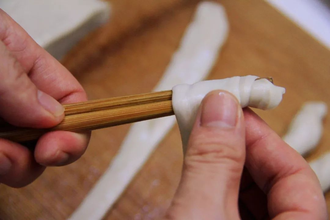 7. 取一块小面团,先用2根筷子夹住面团的一头,转动筷子边拉伸开面团,将面团均匀的缠绕在筷子上,拉紧一些,缠上后就会粘在一起了,最后从筷子上取下来即可。