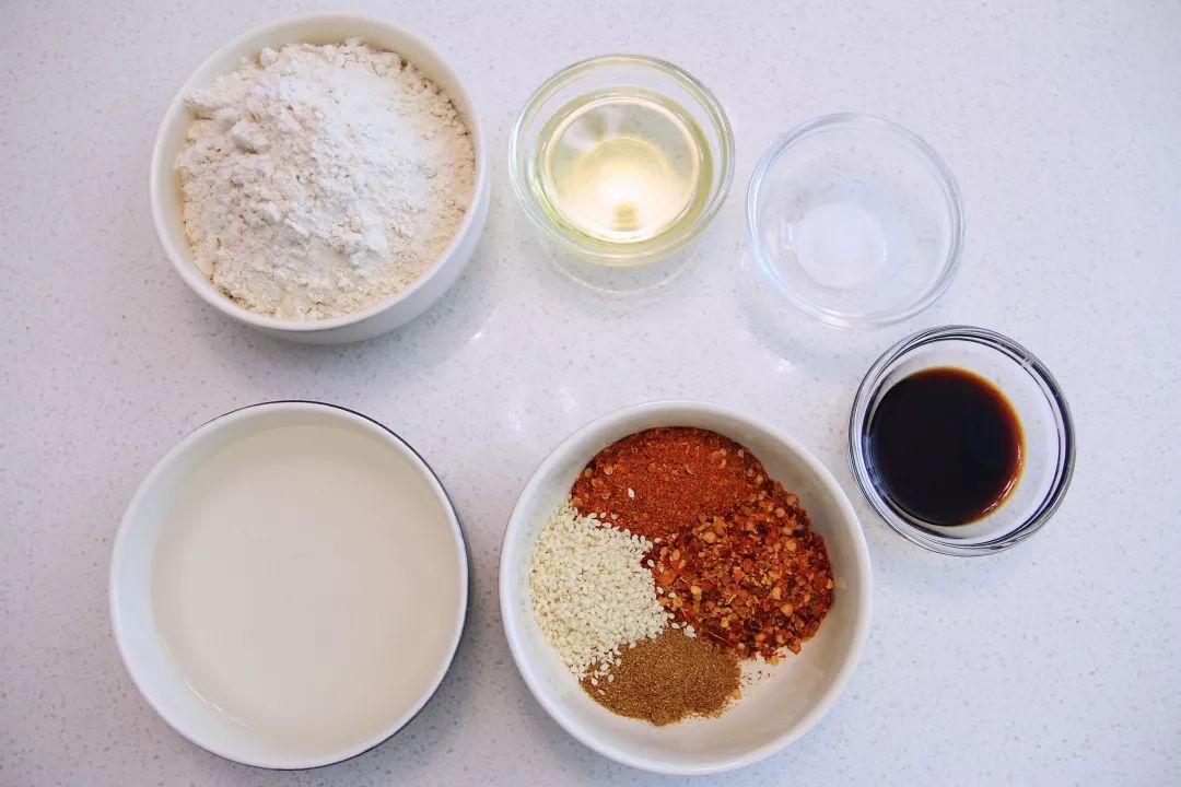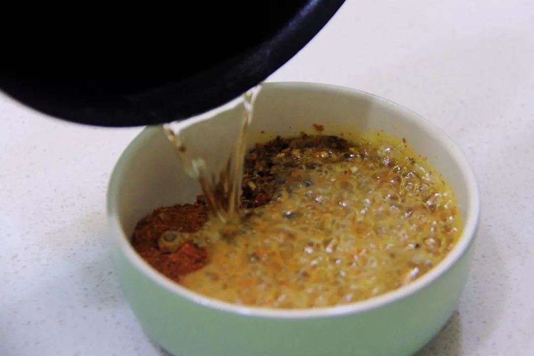 12. 准备辣椒油调料:将辣椒粉、孜然粉、白芝麻混合,将油加热后倒入,拌匀,再倒入生抽拌匀,辣椒油就做好了。